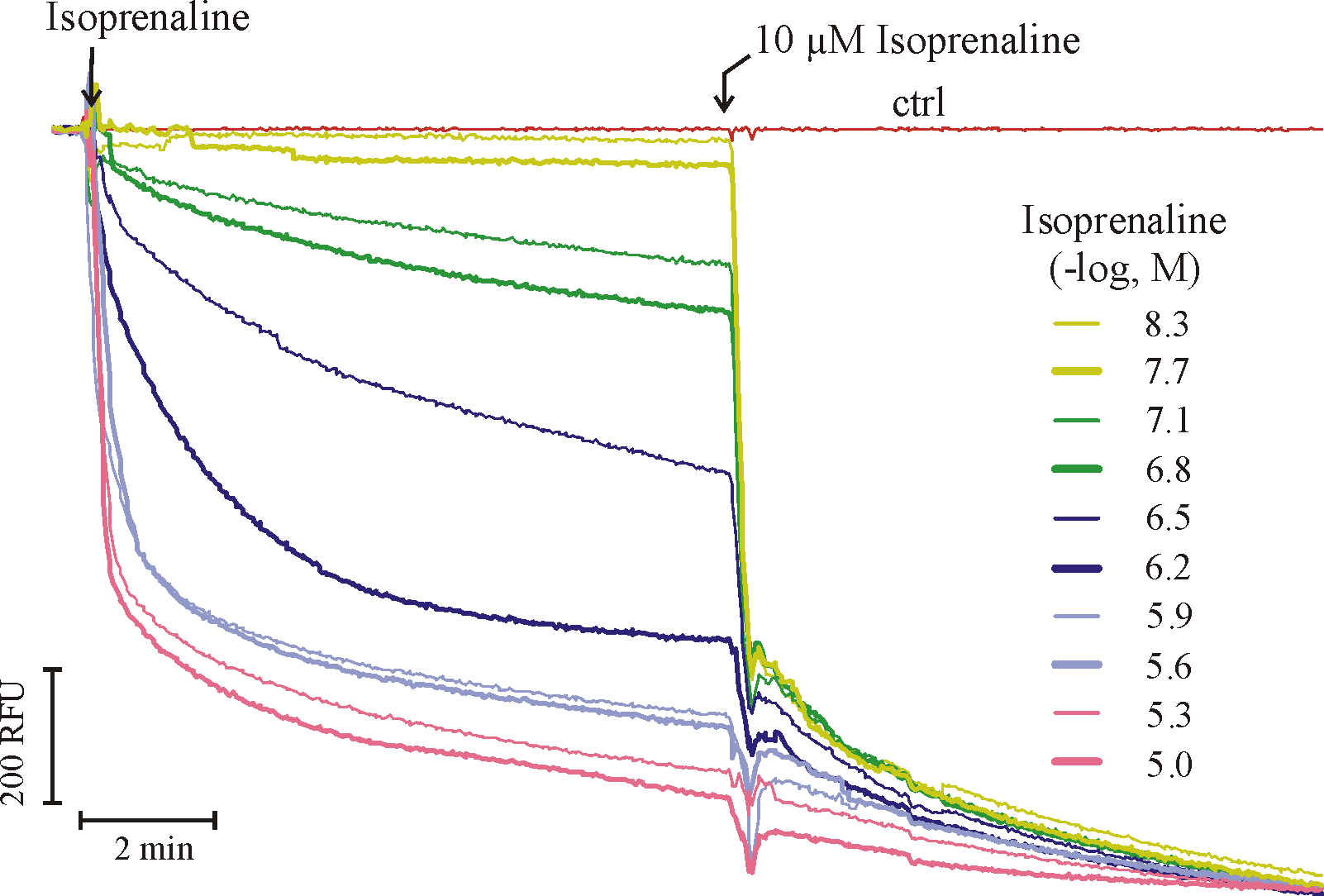 Fig. 2.1: Cell-Free-FRET (CFF) experiment on ß1AR(CFP/YFP) receptors using a ß-adrenoceptor agonist. HEK 293 cells were transfected with ß1AR(CFP/YFP) (permanent cell line) and seeded for 2 days in Petri dishes. After reaching confluency, cells were cracked using hypotonic TRIS/EGTA buffer, transferred into a black 384-well plate, centrifuged and measured in our FRET-Ratio-Detector. Increasing concentrations of isoprenaline induced a stepwise reduction of the fluorescence signal, before a minimum was reached after injection of 10 µM ISO.