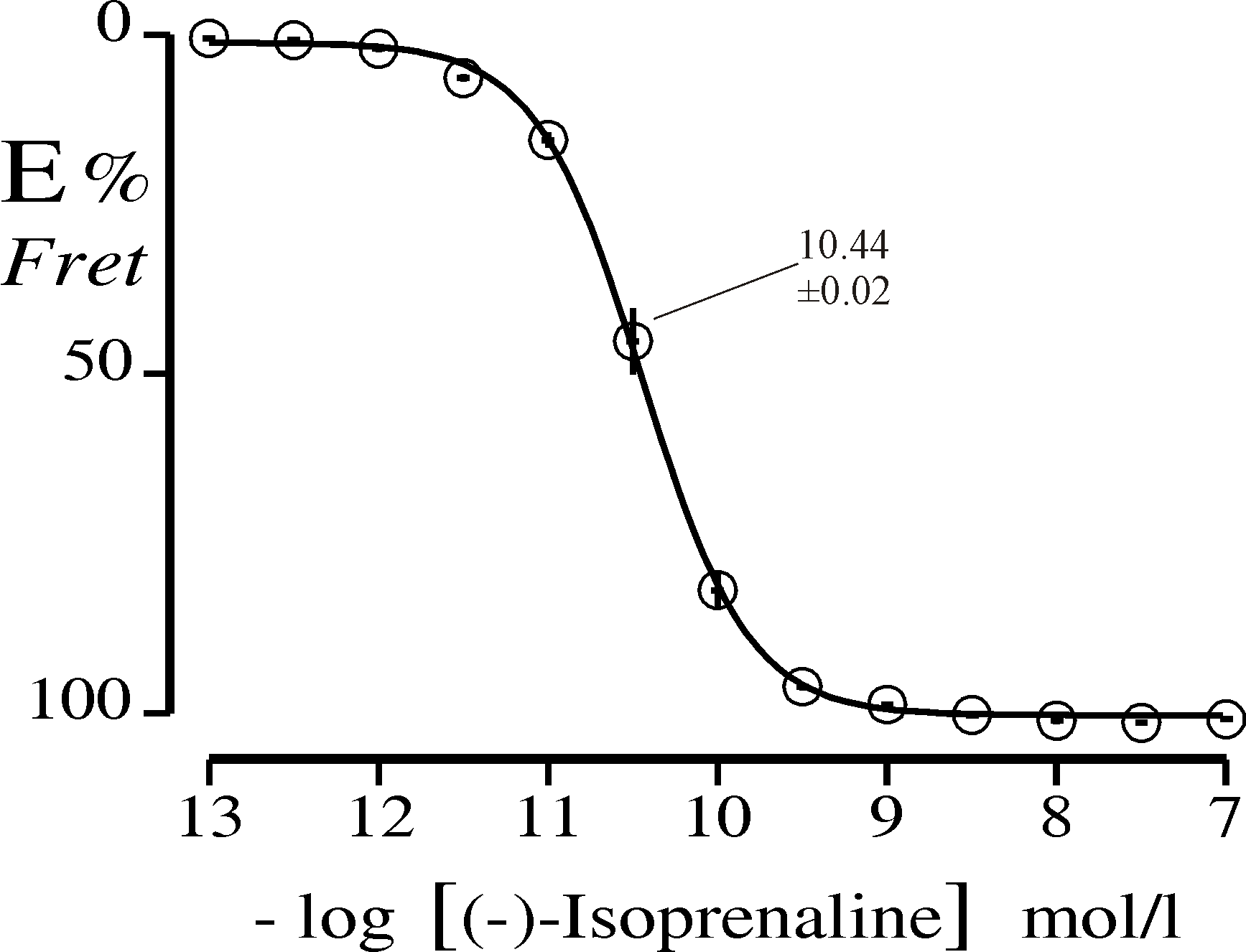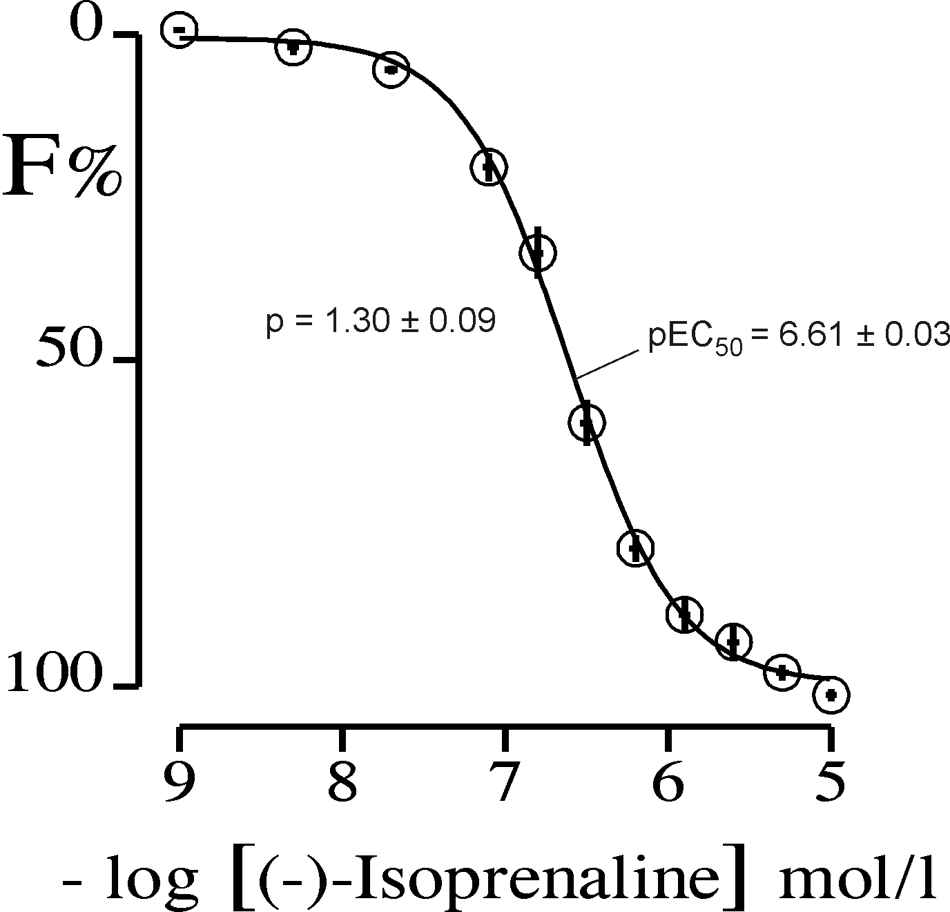 Fig. 2.2: Using the data of Fig. 2.1 and 3 further experiments in CFF-technology a concentration-effect curve for isoprenaline was drived using non-linear regression resulting in an EC50 of ~0.2 µM.