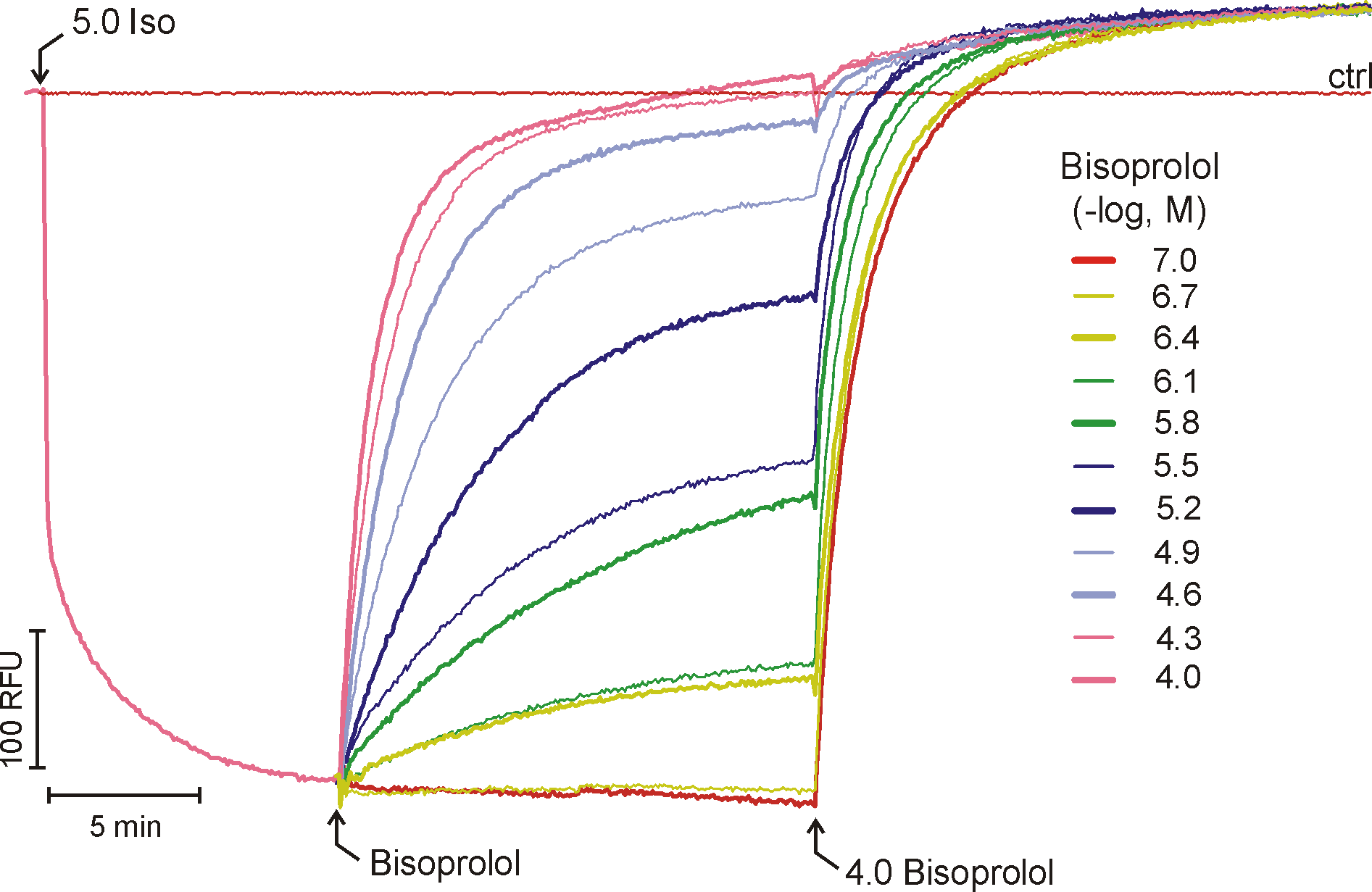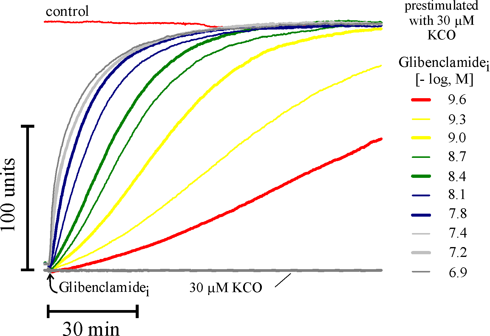 The maximum hyperpolarization can be repolarized dose-dependently with the antagonist glibenclamide (Fig. 1.2). The kinetics of repolarization exhibit different half times, decreasing when induced with increasing glibenclamide concentrations. Measurements were done with LWL-Lab fluorescence detector for 12-well strips (96-well format).
