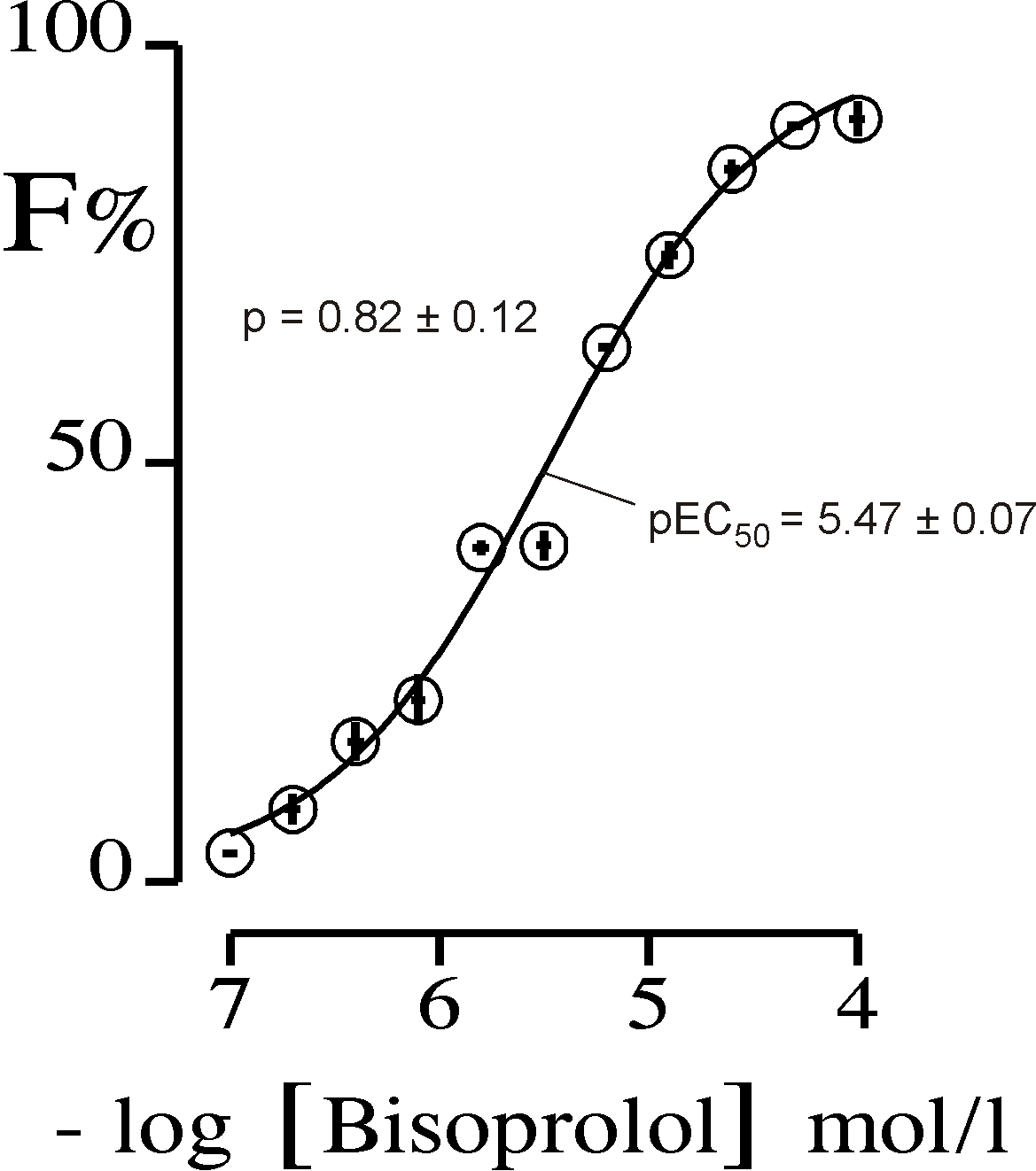 Fig.2.4: Using the data of Fig. 2.3 and 3 further experiments in CFF-technology a concentration-effect curve for bisoprolol was driven using non-linear regression resulting in an EC50 of ~3.0 µM.